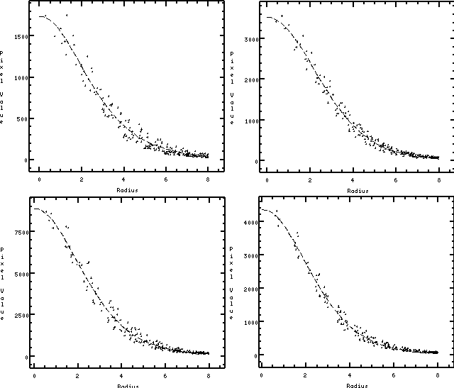 M13 observed through the y-filter (exposure time: 5min).  Radial PSF profile of stellar images in the four outer corners of the M13 frame. One pixel corresponds to 0.176arcsec. The FWHM's are 0.81arcsec (4.6 pixel).