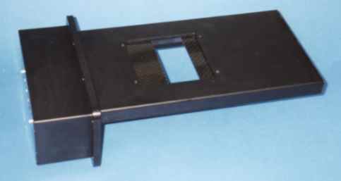 The shutter is a removable drawer-like unit. The flat part is inside the instrument housing (the cube) and the left hand side box (with motors/encoders) outside. Shutter interiors: Visible are the two carbon fiber blades, the linear ball bearing rails and the toothed belts.