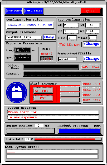 with the button for Electronic Reset. If you get many error-messages like "no serial connection" or "timeout in select" or if you only get noise instead of an CCD-Image, push this button and wait until you get the message in the System Messages lines "Press start for a new exposure". Attention! The following 3 images after the reset may have a slightly higher noise level!