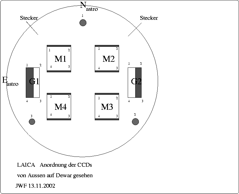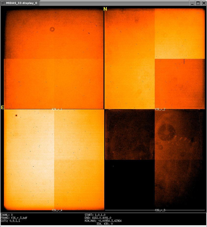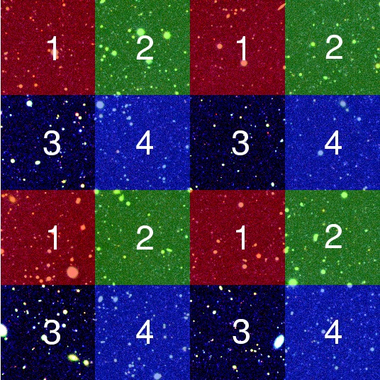 The arrangement of the CCDs is shown here as CAD image and a true foto here . In order to get a contiguous field, one has to fill in the gaps between the CCDs, i.e. 4 telescope pointings are needed for full coverage of a 1 square degree field (see illustration). There is a macro (@@ expose) to facilitate this and procedures to assemble a mosaic of the 16 images will become available (see here). The data are stored on disk in FITS format. Each exposure creates 4 files, one for each CCD. If the root of the filename you entered in the GUI is eg. JAN12 , and you have already 10 files on disk, the next exposure will produce files JAN120011_1.fits, JAN120011_2.fits, JAN120011_3.fits, JAN120011_4.fits for CCD 1,2,3 and 4, respectively. The numbering scheme of the CCDs is: