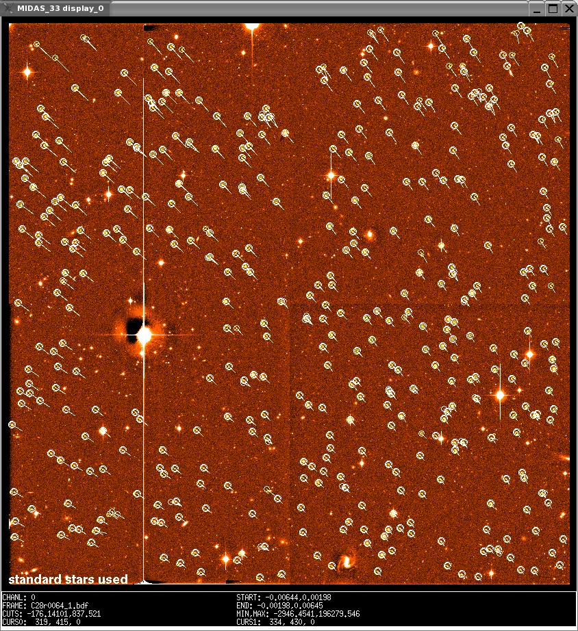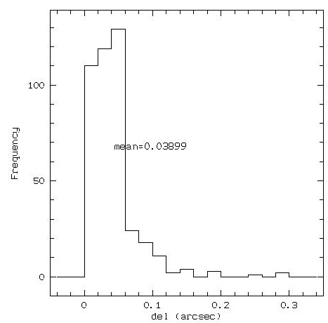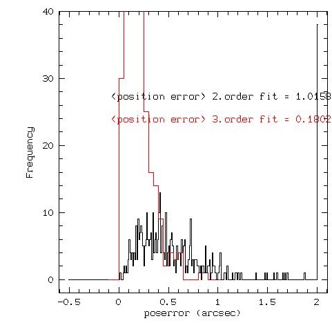Third step is to compute the astrometric solution. SExtractor is used to find objetcs on the frames. The stars for which a match in linear WCS position and cataloge is achieved within certain tolerance are identified, an astrometric solution of 2.nd order calculated, stars for which the difference in catalogued and astrometric solution is larger than 1 arcsec discarded and a 3.rd order fit calculated. A typical result of this is shown here; the lengths of the arrows indicate the positions of the stars if there were no distortion. A histogram of the astrometrical errors here. Note that this histogram reflects the errors in the COSMOS data, too. Astrometric errors in the finally rebinned files are on the order of 0.03 arcsec as shown by this histogram of the differences in positions of medium bright stars on 2 frames. Computation of the astrometric solution is time consuming and done in batch mode