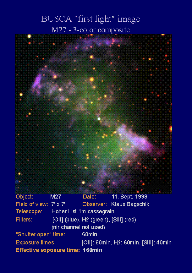By Easter 2001 BUSCA, the 64 Megapixel Bonn University Simultaneous Camera, will undergo the official commissioning procedure at Calar Alto. From then on it will be available for the community. In April 2000 the camera had its first Calar Alto test run. A second run followed in September 2000. In September BUSCA has been tested at the 1m Cassegrain telescope of the Hoher List Observatory. At September 11 it has seen First Light.(Only few days later another new instrument (VLT/UT1/FORS) received first light from the same object. If one compares our image with the ESO image it's obvious that our stars are BIGGER!)