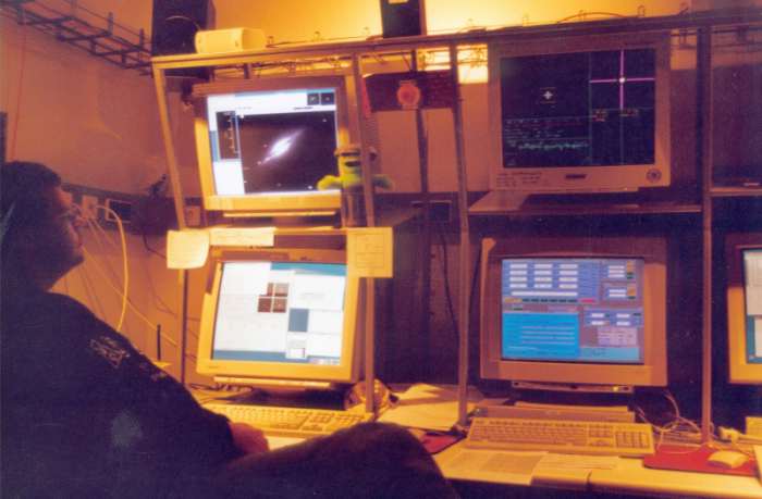 | The observers environment: On the lower left hand monitor the Busca GUI with its characteristic 4 thumbnail windows for real time data display (active during data acquisition). |
