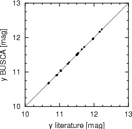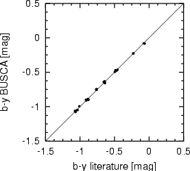 | Magnitude and color calibration relations. Residuals with respect to a slope of 1.0 show a scatter of 0.010mag for y and 0.012mag for b-y. |