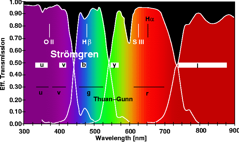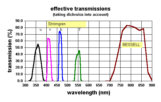 | The Four BUSCA wavebands. They are named - from left to right - uv, b, r, nir. Indicated are positons and widths of standard line, intermediate and broadband filters. Filters marked by white horizontal bars (u,v,b,y, Bessell I) are at present available. | Effective tansmission of the available Strömgren and broad band filters (CCD QE not included). H beta (wide), H beta (narrow), are also available. |