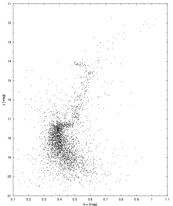 From this diagram a limiting y-magnitude of about 20 mag can be derived (exposure time: 30min, photometric error: 0.05mag). The CMD shows a well defined red horizontal branch and turn off point. Some of the scatter in the diagram may be due to differential reddening, although this has to be investigated in detail. The red giant branch is not well populated as already mentioned by Geffert et al. (2000).