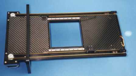 | The shutter is a removable drawer-like unit. The flat part is inside the instrument housing (the cube) and the left hand side box (with motors/encoders) outside. | Shutter interiors: Visible are the two carbon fiber blades, the linear ball bearing rails and the toothed belts. |