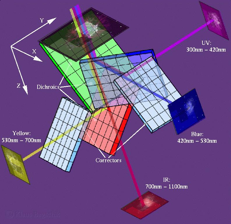 The four colored squares, purple, blue, yellow and red represent the CCD-detectors (sorted by increasing wavelength). The CCDs for "UV" (purple) and "IR" (red) show the observer their illuminated faces, whereas the "blue" (blue) and "yellow" (yellow) CCDs are seen from their rear (dark) sides.