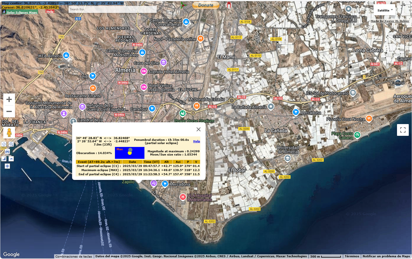 Mapa de Almería con los datos precisos del eclipse del 29 de marzo 2025 para la playa del Zapillo, extraído del excelente sitio de Xavier Jubier http://xjubier.free.fr/en/index_en.html