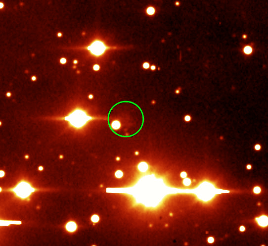 Imagen en luz roja (filtro R) tomada en el Observatorio de Calar Alto con el instrumento CAFOS acoplado al telescopio de 2.2 m el 6 de octubre de 2007, apuntando a la región de Cassiopeia A. Se trata, de hecho, de la imagen en la que se descubrió el eco de luz que más tarde se observaría con mayor detalle mediante el telescopio Subaru para obtener el espectro de la supernova. El eco de luz aparece marcado con una circunferencia.