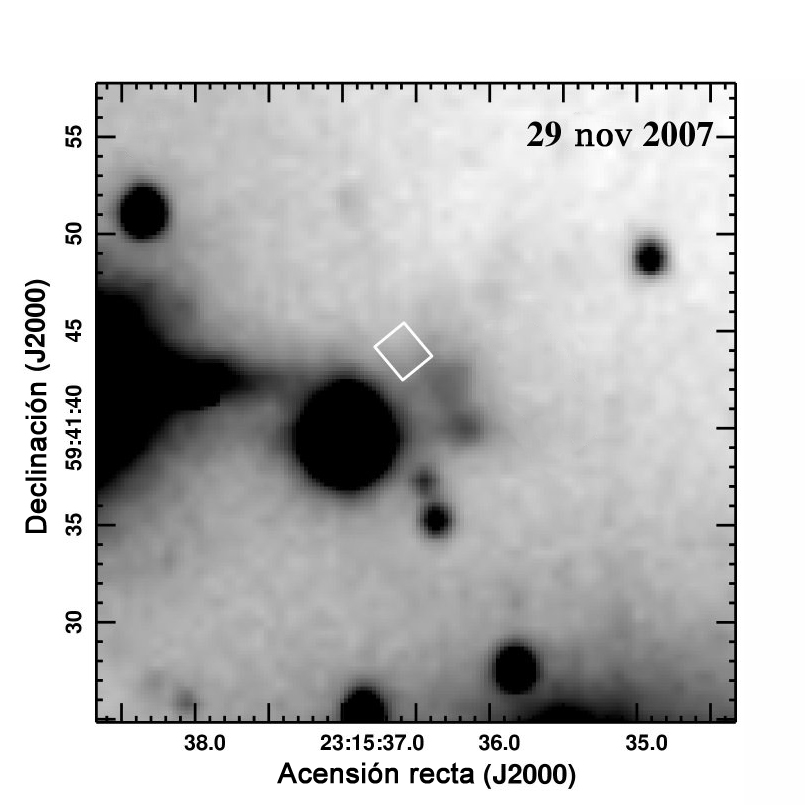 Otra imagen más en luz roja (filtro R) obtenida con el telescopio de 2.2 m en Calar Alto, con CAFOS, cierto tiempo después. El área sometida a estudio espectroscópico con Subaru se señala con un recuadro blanco.