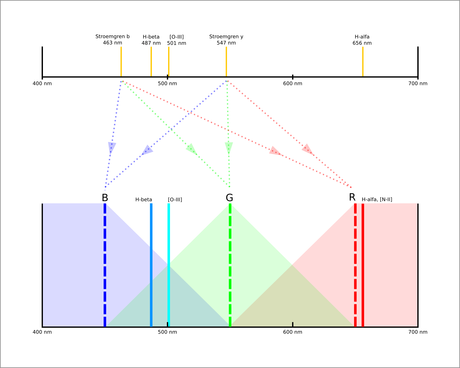Los filtros utilizados para obtener esta imagen con el telescopio Zeiss de 1.23 m del Observatorio de Calar Alto, así como su distribución en los tres canales de color B, G y R. |