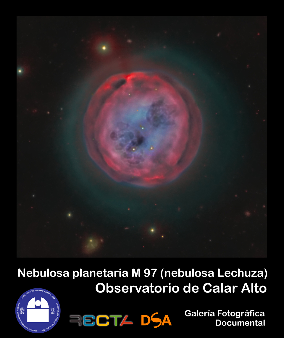 Imagen de M 97 de la Galería Fotográfica Documental del Observatorio de Calar Alto (CAHA-RECTA-DSA). Vicent Peris (DSA/OAUV), José Luis Lamadrid (DSA/ceFca), Jack Harvey (DSA/SSRO), Steve Mazlin (DSA/SSRO), Juan Fabregat (OAUV), Gilles Bergond (CAHA). Versión no comprimida (TIFF). (3 MB)