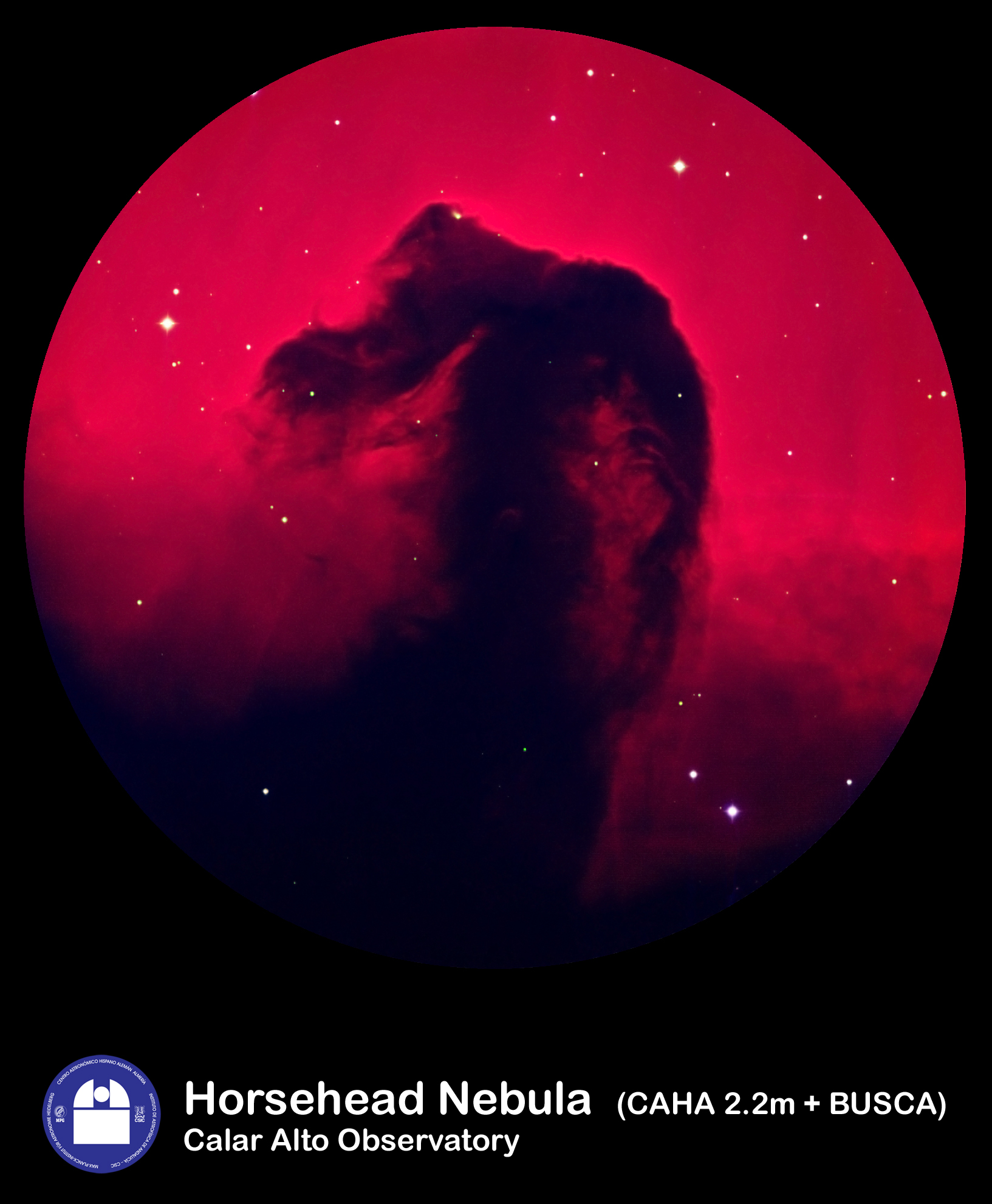 La conocida nebulosa Cabeza de Caballo en Orión (también denominada Barnard 33) fotografiada desde Calar Alto. Esta nebulosa de forma tan pecular se descubrió en 1888 en una placa fotográfica obtenida en el Harvard College Observatory. La nebulosa está situada justo al sur de Alnitak, la estrella más oriental del Cinturón de Orión, y se encuentra a unos 1500 años-luz de la Tierra. Tiene unas dimensiones aproximadas de 3.5 años-luz. El resplandor rojizo se debe al gas hidrógeno que ocupa el espacio situado tras la nebulosa, y que brilla al ser ionizado por la estrella cercana sigma Orionis.