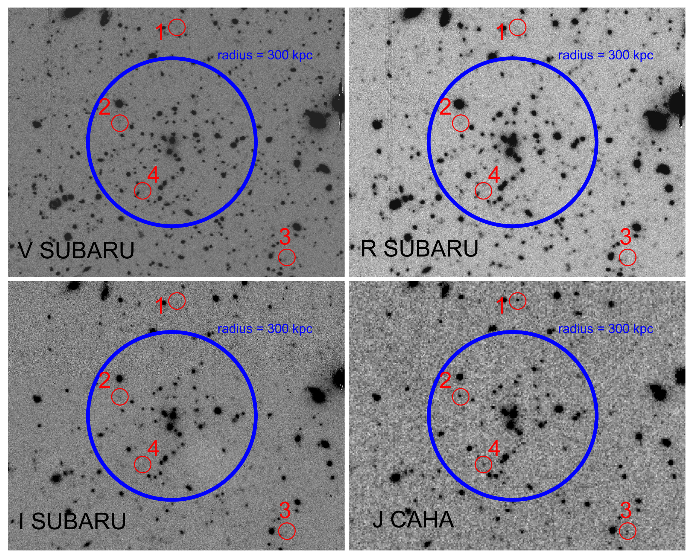 El entorno del cúmulo de galaxias GHO 1322+3027 observado con distintos telescopios y en varias bandas espectrales. Las circunferencias rojas señalan candidatos a galaxias extremadamente lejanas. La imagen infrarroja tomada en Calar Alto se encuentra abajo a la derecha.