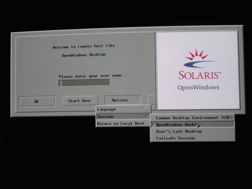 cax14:0.0 XDMCP, connect to "rike", select OpenWindows desktop (not CDE), see Fig. 2.