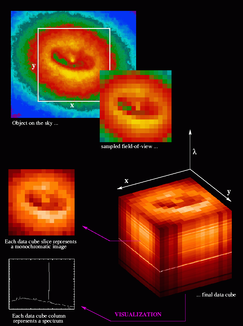 Fig. 1 :   Principle of Integral Field Spectroscopy (IFS):  a two-dimensional field-of-view on the sky (white frame) is sampled into discrete spatial elements, which can have a round, hexagonal,  or (like in this example) square shape. These spatial elements are sometimes called SPAXELS in order to distinguish them from ordinary PIXELS of direct imaging instruments. The peculiar virtue of IFS consists in the ability to create an individual spectrum for each spaxel simultaneously over the whole field-of-view. After data reduction, the set of generated spectra can be rearranged in a computer to form a 3-dimensional data cube of two spatial, and one wavelength coordinates. Hence also the term "3D-Spectroscopy" is sometimes used for IFS. Note that in the presence of atmospheric refraction the data cube in fact becomes a data rhomboid because of spatial shift as a function of wavelength. From the data cube (or rhomb) one can extract a spectrum for each indvidual spaxel, or a coadded spectrum for a group of spaxels (say within a digital aperture). Alternatively, it is possible to create monochromatic images or coadded quasi-broadband images from slices of the datacube.