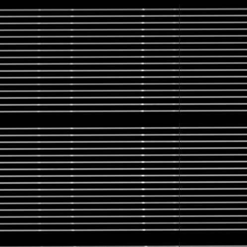 The upper left frame shows a single full 2K x 4K image, which is the current standard configuration. Note that the criss-cross pattern has nothing to do with the response of the system but is merely an aliasing effect of the display. The square format lower right picture is an enlarged portion of this exposure, approximately from the middle of the chip. There are two sets of 16 spectra visible, corresponding to two rows of spatial elements of the lens array, the gaps clearly marking them as distinct groups. The brighter spots which are superimposed on the continuum are indicative of emission lines which were produced by the Neon spectral line lamp, operating in this case in parallel with the continuum lamp.