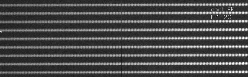 Scan yourself through a series of continuum flatfield PYTHEAS exposures with etalon spacing increments of 20nm in the wavelength region near 500nm. The picture shows a small fraction of the CCD frame with 9 PMAS spectra in the wavelength region near 500nm. The dark line in the middle serves as a reference. Observe how the Fabry Perot orders which are aligned like pearls on a string move from left to right as the etalon spacing is incremented. Use your browser FORWARD and BACKWARD buttons to step back and forth to better see the effect. Compare later with a similar scan of science exposures targeting the planetary nebula NGC6543.