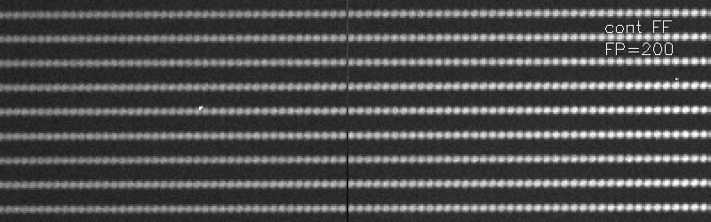 Scan yourself through a series of continuum flatfield PYTHEAS exposures with etalon spacing increments of 20nm in the wavelength region near 500nm. The picture shows a small fraction of the CCD frame with 9 PMAS spectra in the wavelength region near 500nm. The dark line in the middle serves as a reference. Observe how the Fabry Perot orders which are aligned like pearls on a string move from left to right as the etalon spacing is incremented. Use your browser FORWARD and BACKWARD buttons to step back and forth to better see the effect. Compare later with a similar scan of science exposures targeting the planetary nebula NGC6543.