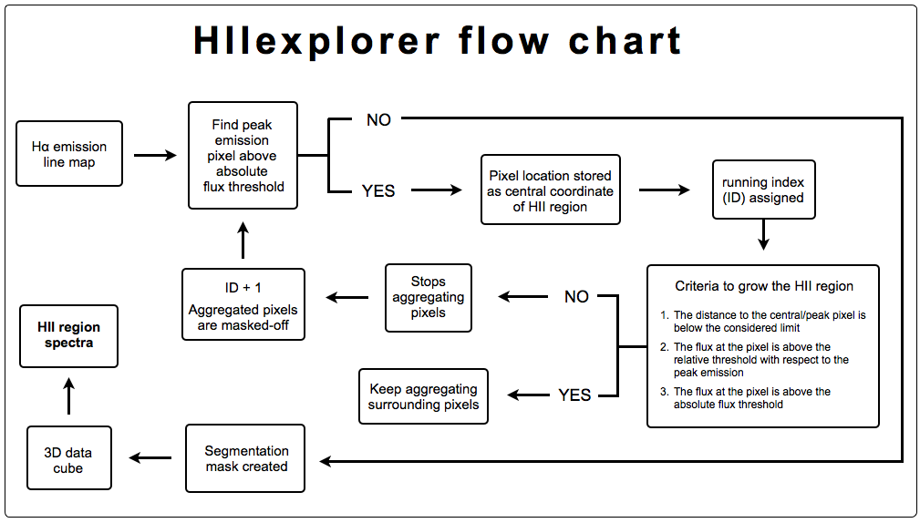 Basic description HIIexplorer is a package for detecting and extracting the integrated spectra of HII regions from IFS datacubes. The procedure is based on some basic assumptions: (a) H ii regions are peaky/isolated structures with a strong ionized gas emission, clearly above the continuum emission and the average ionized gas emission across the galaxy; (b) H ii regions have a typical physical size of about a hundred or a few hundreds of parsecs (e.g. Gonzalez Delgado & Perez 1997; Lopez et al. 2011; Oey et al. 2003), which corresponds to a typical projected size at the distance of the galaxies of a few arcsec for galaxies at z~0.016 (the ones used in the studies of our interest). The algorithm requires a set of input parameters: (i) a line emission map, with the same world-coordinate system (WCS) and resolution as the input datacube (preferentially an H-alpha emission line map); (ii) a flux intensity threshold for the peak emis- sion of each H ii region; (iii) a maximum distance to the peak location for a pixel associated with each H ii region; (iv) a relative threshold with respect to this peak emission of the minimum intensity of each H ii region; (v) an absolute threshold of the minimum intensity corresponding to each H ii region. All these parameters can be derived from either a visual inspection and/or a statistical analysis of the Hα emission line map. The algorithm produces as an output a segmentation FITS file describing the pixels associated to each H ii region, designated with a running index starting with 1 (e.g. the primary H ii region ID in this article), with the zero reserved to areas not associated with any H ii region (i.e. regions free of emission or below the absolute threshold described above). The segregation algorithm is based on a simple iterative pro- cedure, summarized in the flow chart shown in Fig. 1. As a first step the algorithm looks for the brightest pixel within the emis- sion line map. Its location is stored as the peak/central coordinate of a new H ii region, associated with a certain running index (ID number). After this, the adjacent pixels are aggregated to this H ii region if all of the following criteria are fulfilled: (i) the dis- tance to the central/peak pixel is below the selected limit; (ii) the flux at the pixel is above the relative threshold with respect to the peak emission; (iii) the flux at the pixel is above the absolute flux threshold described before. Whenever any of these criteria are not fulfilled the aggregation procedure stops, the ID number is increased by one, all the aggregated pixels are masked-off, and the peak-identification procedure is repeated. The overall proce- dure stops whenever no new peak is detected above the selected peak-intensity threshold.